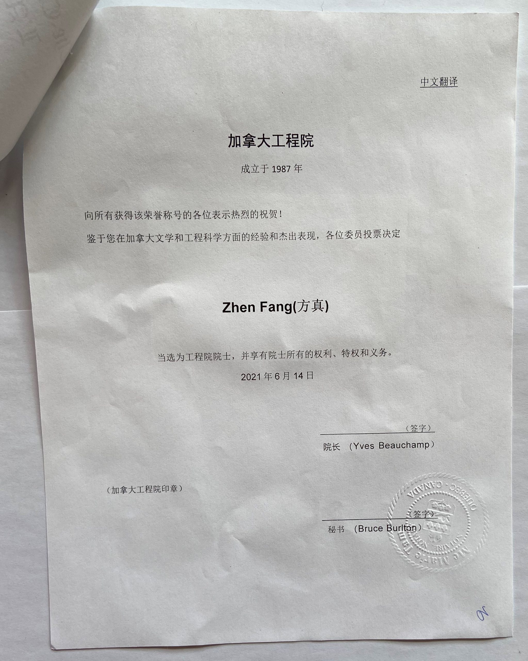院士当选证明Certificate of FCAE