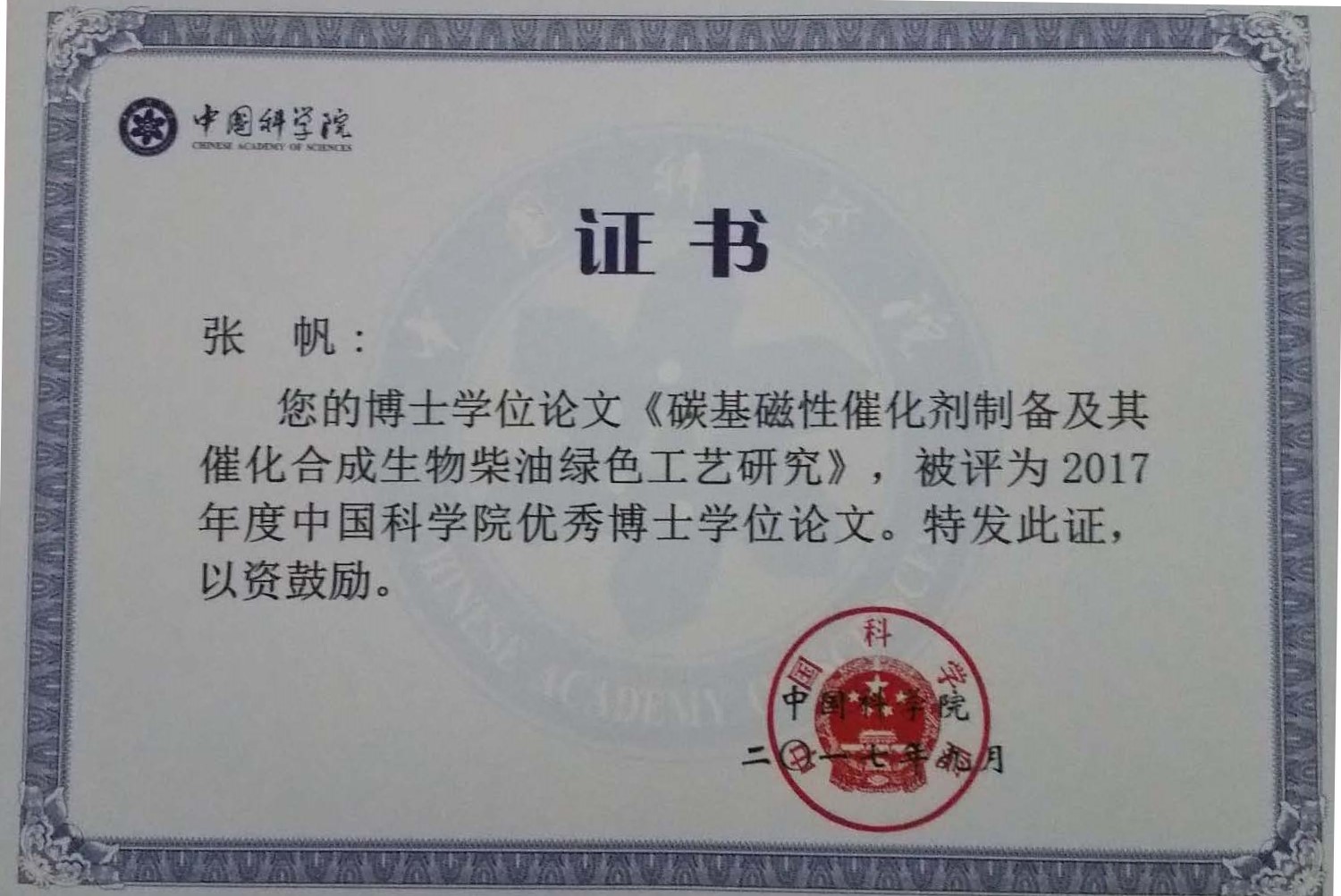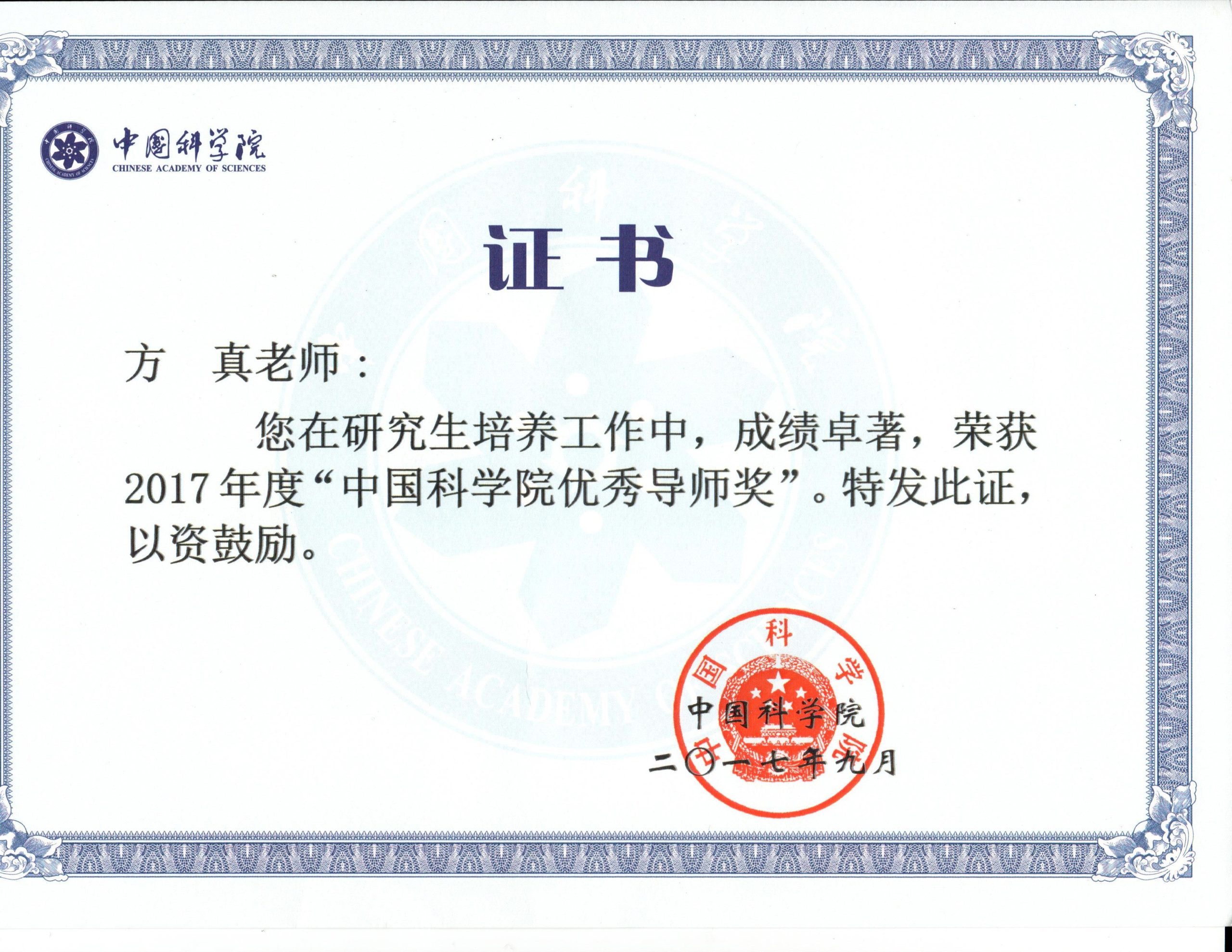 Mr. Fan Zhang won 2016 CAS presidentaward for his dissertation中科院优博论文