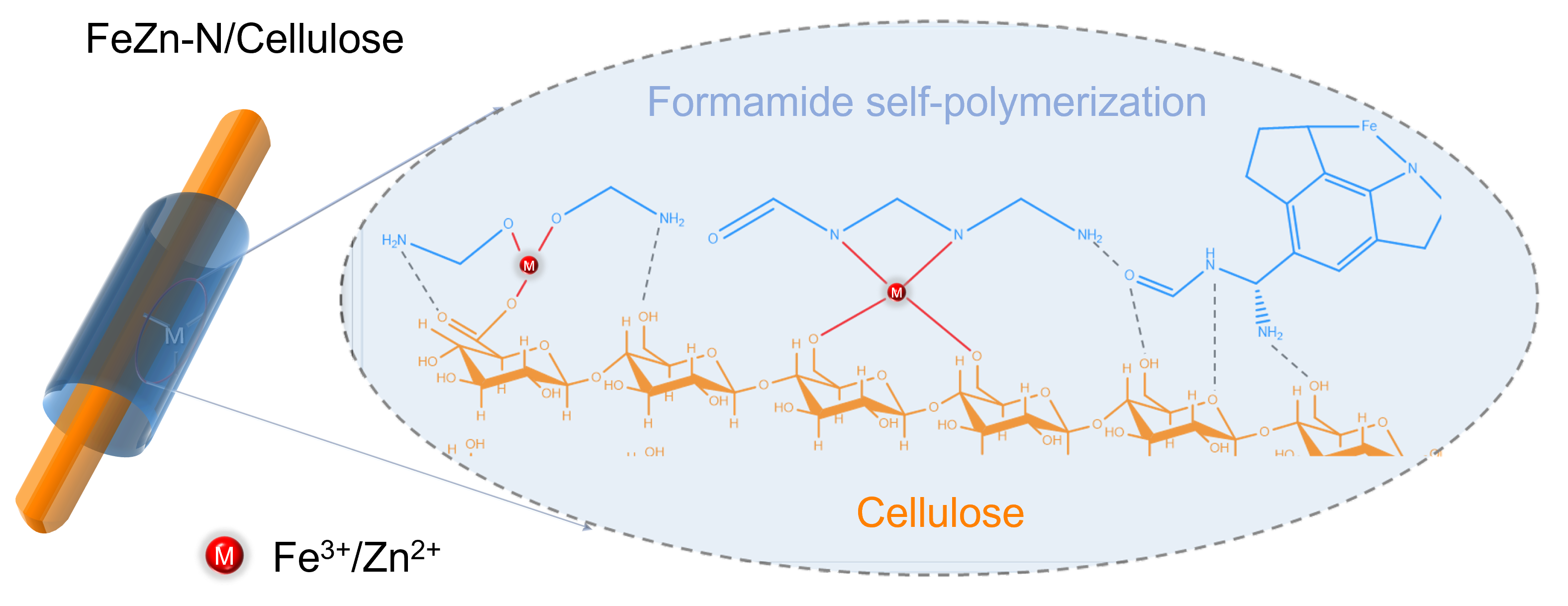 通过将铁(Fe³⁺)与甲酰胺溶液在纤维素表面配位并碳化的方法,在纤维素衍生碳表面包覆Fe/N层,成功制备了具有Fe/Fe₃N封装碳活性位点的氧还原催化剂(Fe/Fe₃N/C),旨在提升生物炭表面作为燃料电池阴极的电导率。该Fe/Fe₃N/C催化剂在0.5 M H₂SO₄电解液中相对于可逆氢电极表现出0.74 V的半波电位,并具有超过100小时的卓越稳定性。电化学阻抗谱测试表明,采用该新颖方法制备的催化剂电荷转移电阻仅为1.671 Ω,证实纤维素衍生碳核芯显著提升了电子传输效率。量子力学计算验证了甲酰胺中的羰基与纤维素中的羟基通过碳化过程与铁形成强配位作用,最终构建Fe/Fe₃N结构。本研究为质子交换膜燃料电池提供了一种有效的可再生材料解决方案。