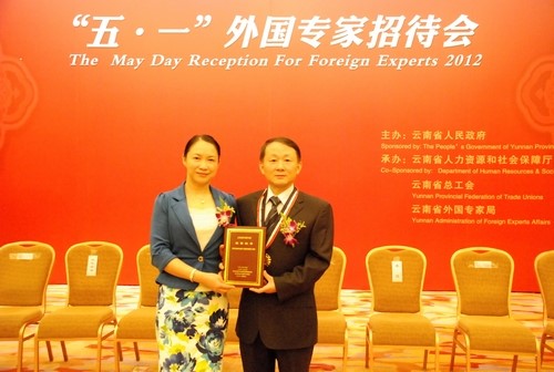 On April 26, the 2012 Yunnan Foreign Expert “Caiyun Award” Ceremony and the Foreign Expert “May 1st” Reception were grandly held at the Zhenzhuang Hotel in Kunming, organized by the provincial government. A total of 10 experts received the award. Prof. Zhen Fang, leader of the Biomass Research Group at the Xishuangbanna Tropical Botanical Garden of Chinese Academy of Sciences (CAS), attended the ceremony as one of the 10 awardees and the only expert from the Kunming Branch of CAS to receive this honor.