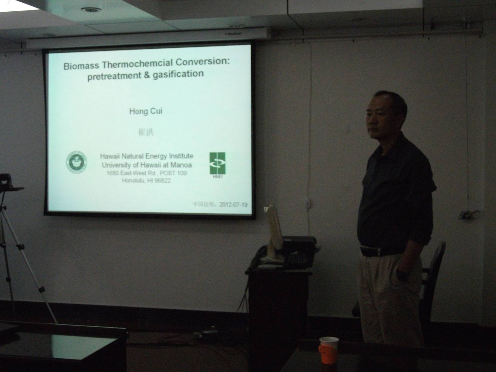 In the morning of July 19, Dr. Hong Cui used dominant biomass resources (Leuceana, Bagasse and Banagrass) in Hawaii as cases to report the theme of Biomass Thermochemcial Conversion. The contents involved Biomass pretreatment, Gasification process and Gas cleanup (Syngas composition analysis; Gaseous sulfur species analysis; Tar sampling and analysis; NH3/Cl sampling and analysis; HCN sampling and analysis; Trace elements sampling and analysis).
