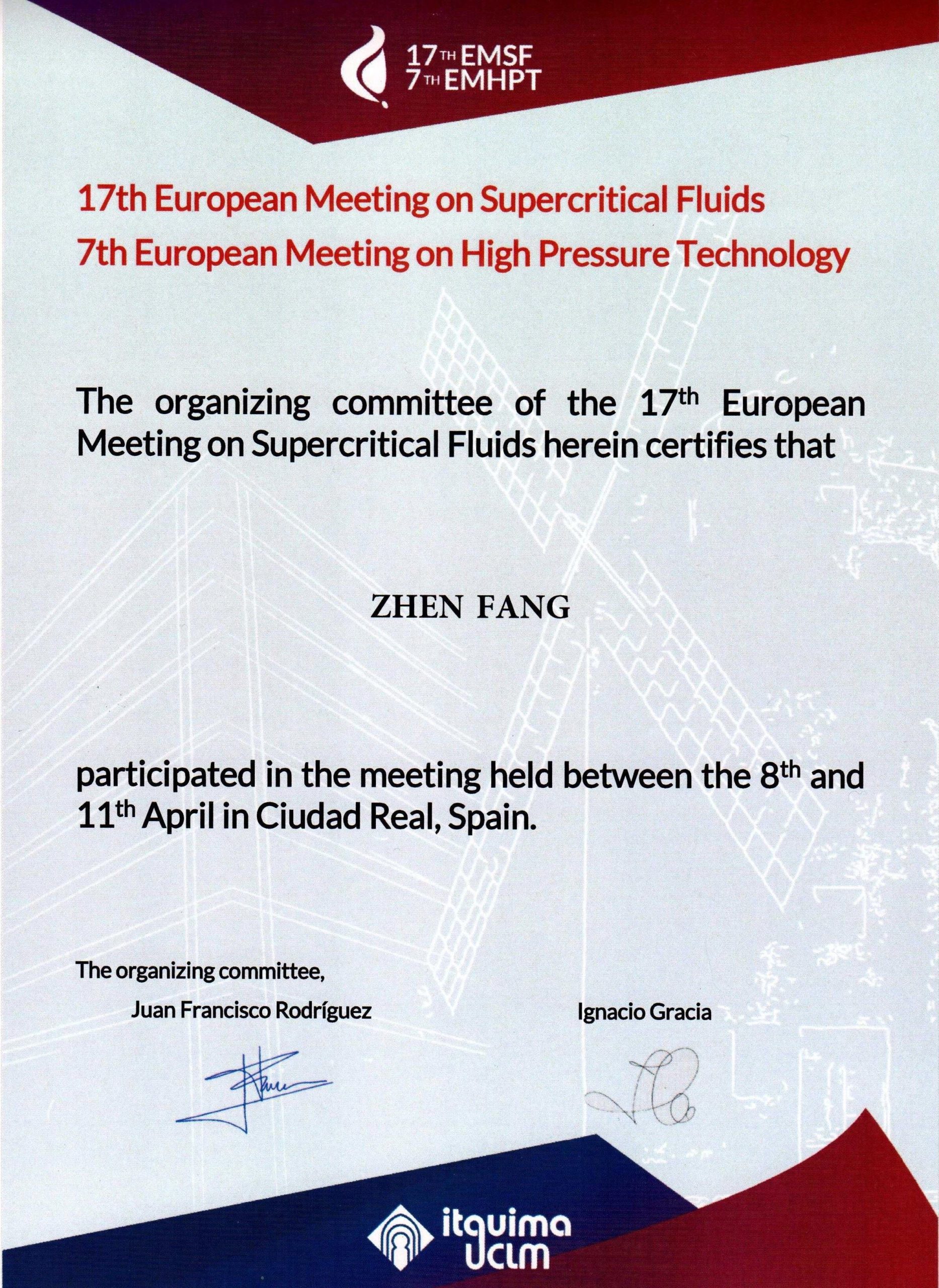 2019年4月8日至11日, 方真教授,弹指一挥间回到阔别23年的西班牙,出席了在雷阿尔城举行的第17届欧洲超临界流体会议(EMSF2019)和第7届欧洲高压技术会议(https://eventos.uclm.es/16387/detail/17-thsubindice-isasf-congress.html),并做了主旨发言。演讲题目为《水热转化可再生资源和废弃物为燃料》,内容包括:水热性质、生物质转化、水解、超临界水氧化、塑料回收和颗粒合成。此外,他亦担任一个分会的主席,并作为“杰里.金墙报奖”评选委员会成员,协助评审最佳墙报。
